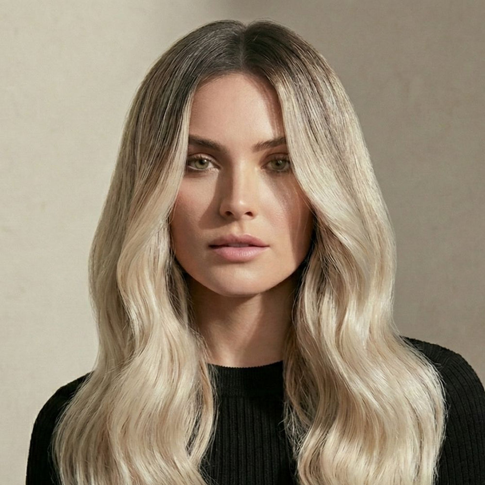 Color #T1CC/80 Smokey Blonde is a cool, smoked gradient—an ashed mochaccino root dissolving into clean, frost-white lengths. The transition is seamless and sophisticated, offering an editorial softness with a high-contrast finish that feels modern, airy, and deliberately refined.