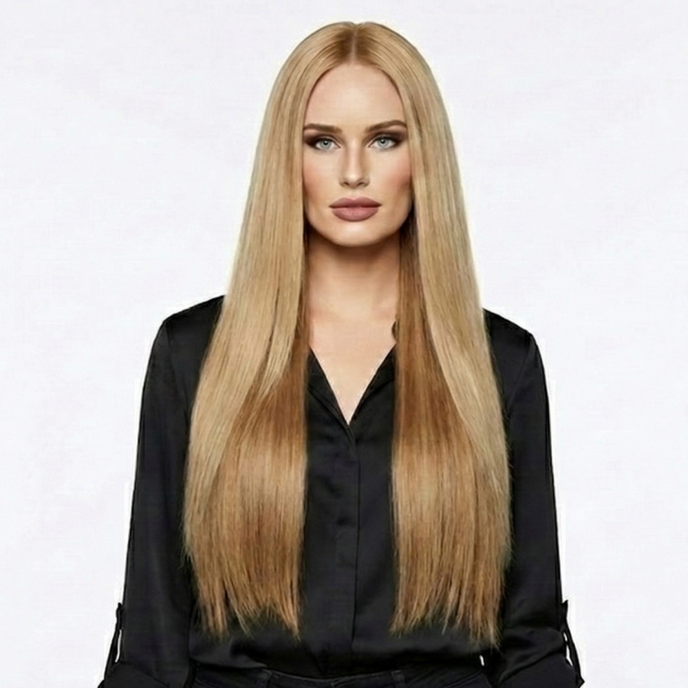 Color #6/18 Sea Salt and Caramel is a polished bronde with a cool, salted-beige veil and a caramel glow beneath—balanced, modern, and quietly radiant. Dimension is seamless and controlled, like sunlit satin over warm sand.